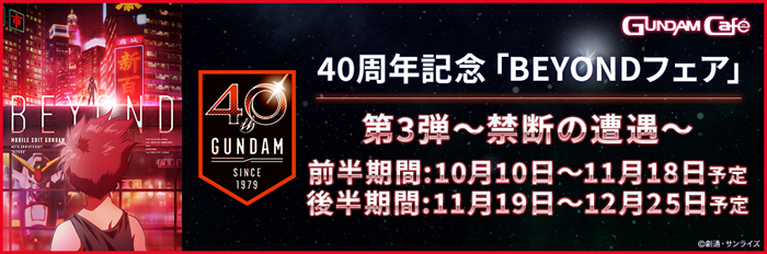 鋼彈官方咖啡廳「GUNDAM Café」各門市與大阪「GUNDAM SQUARE」,從11月19日(二)起,開始舉辦「機動戰士鋼彈40th記念BEYOND祭典第3彈~禁忌的遭遇~後半」。