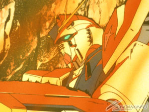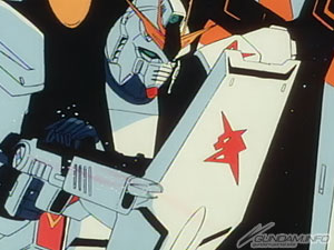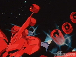 這邊的感應砲本體和ν鋼彈的鰭狀感應砲不同,還沒使用的時候會變成圓筒形。感應砲自本體射出後,分離的蓋子會向四方展開,光束砲也伸長進入攻撃態勢。而且與過去的感應砲相比光束威力和運作時間效能也都大幅度提升! 和在『機動戰士鋼彈』當中被打到體無完膚的時候相比可是大不相同啊! 面對阿姆羅駕駛的鋼彈也完全不覺得會輸啊(←唉呀、旗標又立起來了)。