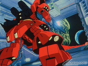 介紹完阿姆羅・雷的機體,當然也要介紹他的對手-新生新・吉翁總帥,夏亞・阿茲納布爾搭乘的MS(←不論是三倍速或是紅通通都一點沒變呢)沙薩比(MSN-04 全高:25.6m,本體重量:30.5t),當然不能不好好介紹啦! 這個機體是舊 新・吉翁的技術人員設計,算是先前的吉翁系MS的集大成。為了製造這台機體需要的設備不足,因此也不是由新生新・吉翁軍内部製造,而是與鋼彈同樣委託安納罕電子公司開發,並且在格拉那達的工廠中製造的(←有點囉嗦呢)。