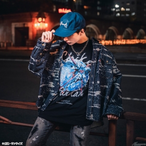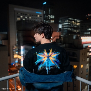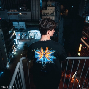 自由鋼彈主題T恤,融合當代水彩技法,於背面展現壯麗華美的自由鋼彈姿態。機體名稱、型號與標誌則巧妙點綴於前身與背部,向作品致敬。寬鬆剪裁設計提供舒適的穿著體驗,是日常穿搭的理想選擇。