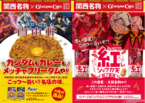 鋼彈官方咖啡廳「GUNDAM Café」各門市和大阪「GUNDAM SQUARE」於明日5月29日(五)起,發售與關西名產「難波自由軒名產咖哩」和「紅薑天婦羅柿種」聯名的商品。
