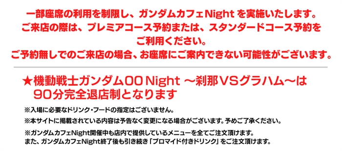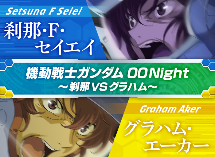 這次的Night焦點在『機動戰士鋼彈00』的刹那・F・塞耶和葛拉漢・耶卡身上。店內除了有2人的名場面、限定飲品&餐點菜單等內容之外,還會實施咖啡廳精選及自由時段。藉由投票時段統計出來的點數,可以欣賞到不同的結尾。