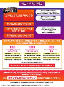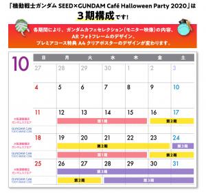 「『機動戰士鋼彈SEED』×GUNDAM Café Halloween Party 2020」分3階段舉辦,不同期間GUNDAM Café精選輯(大螢幕影片)內容及AR照片相框種類、豪華套餐特典「A4透明海報」圖案皆會改變。