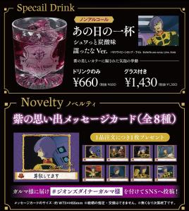 本祭典將舉行能進入吉翁公國軍世界的體驗型晚餐「Zeon's Diner TOKYO」。將會有以「卡爾馬・薩比」個人特色的紫色來推出的限定菜單、限定飲品及贈品「紫色回憶留言卡」登場。