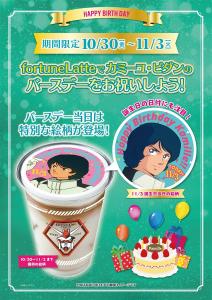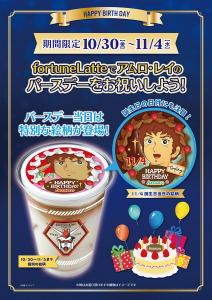 「Birthday fortuneLatte」是由能享受到各種圖片的飲品「 fortuneLatte」推出,是替角色們慶生的特別菜單。預定將從各角色迎接生日的數日前開始,以期間限定方式依序推出。