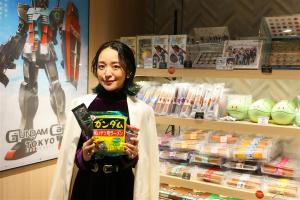 第一次造訪GUNDAM Café TOKYO的潘Megumi,在驚訝其策畫完善的同時,也於店內ZEON'S DINER TOKYO說著「雖然有點不好意思」一邊與“那個人”好好拍下合照。另外堆於GOODS SHOP在意的商品,挑選了人氣「配飯小菜」,系列最辣的「激辛肉味噌 雪拉Ver.」。