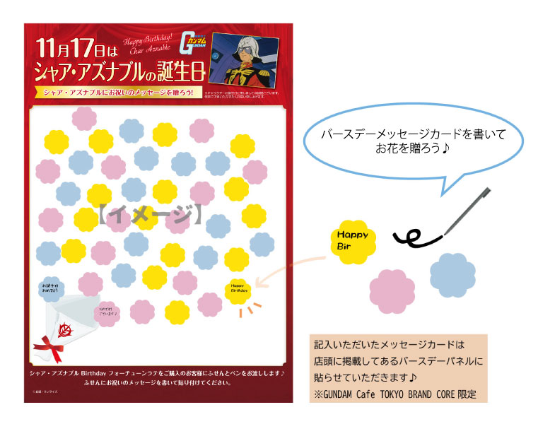在購買「夏亞・阿茲納布爾 Birthday fortuneLatte」時拿到的”留言卡”上,寫下祝賀的留言,裝飾到架設在「fortuneLatte Cafe」門口的Birthday展示板上吧。舉行期間至11月17日(二)為止。