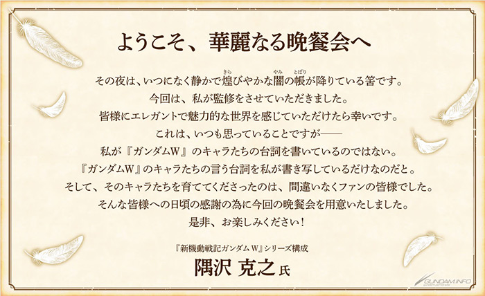 此晚餐節目中展開的全新劇情,由負責『新機動戰記鋼彈W』本傳系列構成的隅沢克之監修。