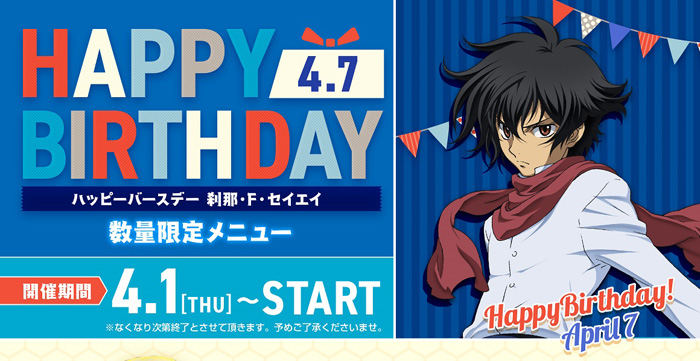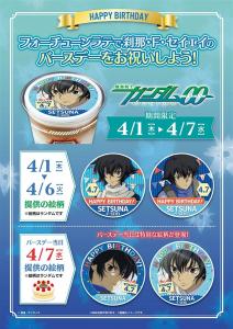 4月7日(三)為『機動戰士鋼彈00』中刹那・F・賽耶的生日,由於「Birthday fortuneLatte」廣受好評,餐廳區域也將推出慶祝生日的”數量限定餐點”。