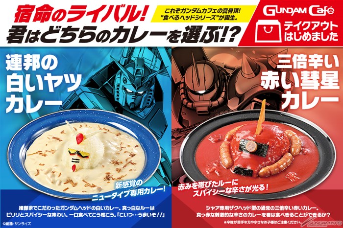 「GUNDAM Café 獨家咖哩」有供應兩種口味,分別是呈現鋼彈的“白色”咖哩「聯邦的白色怪物咖哩」、以及呈現夏亞專用薩克的“紅色”咖哩「三倍辣紅色彗星咖哩」。