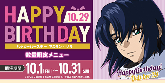 鋼彈官方咖啡廳「GUNDAM Café」各門市和大阪「GUNDAM SQUARE」將於10月1日(五)起,開始舉辦「生日快樂阿斯蘭・薩拉」。