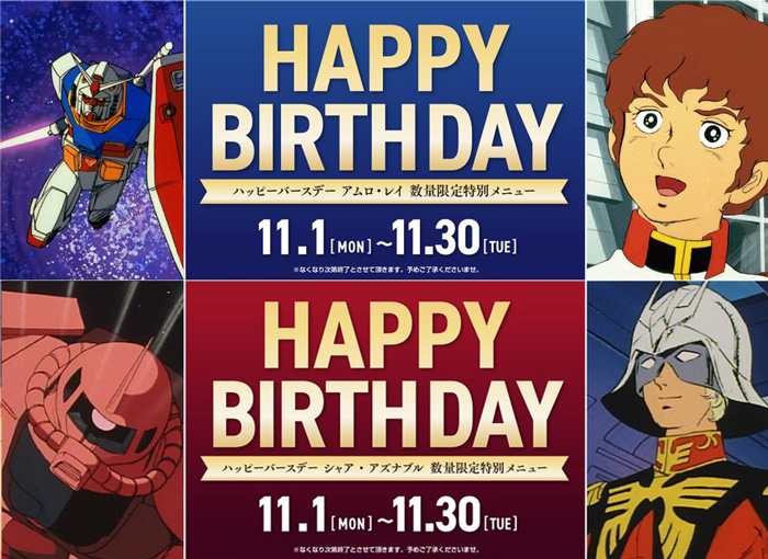 鋼彈官方咖啡廳「GUNDAM Café」各門市和大阪「GUNDAM SQUARE」,將於11月1日(一)起,舉辦「HAPPY BIRTHDAY阿姆羅・雷」和「HAPPY BIRTHDAY夏亞・阿茲納布爾」。