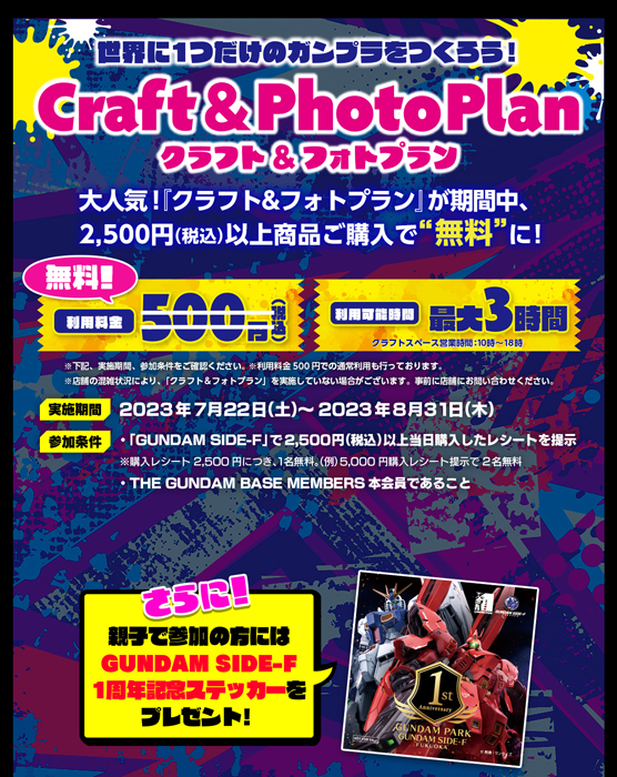 同時,為紀念GUNDAM SIDE-F一週年,只要消費含稅滿2,500日圓以上就可以免費獲得「組裝&攝影方案」的活動也於明天7月22日(六)開始,此外8月開始也將舉辦「鋼彈R(Recycle)作戰2023」,不要錯過。