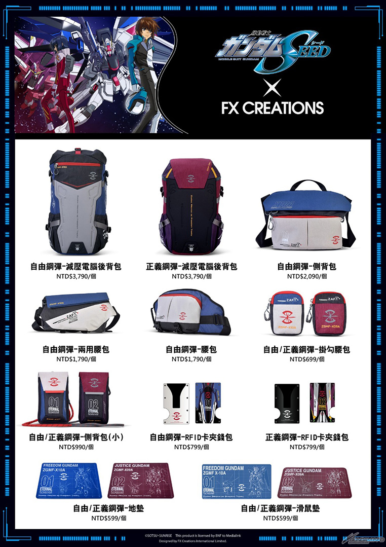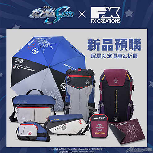鋼彈系列方面,會場內「BTUHOBBYBASE」攤位將發售由『機動戰士鋼彈SEED』和「FX CREATIONS」合作推出的15款新商品。以自由鋼彈和正義鋼彈為主題設計的背包、腰包、滑鼠墊等商品隆重。