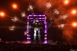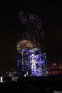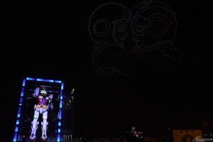 接著隨在『機動戰士鋼彈 逆襲的夏亞』的主題曲「BEYOND THE TIME ~メビウスの宇宙を越えて~」,煙火和約1,000架無人機在夜空描繪阿姆羅和夏亞以及鋼彈的最終射擊。