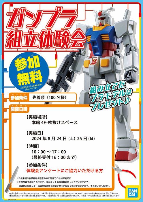 活動免費參加,人數以搶先制到100名為止。因為會贈送組裝好的鋼彈模型,所以請務必藉此機會參加看看。