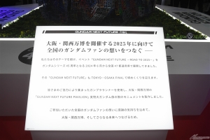 另外還有利用回收的鋼彈模型框架(框的部分)呈現大阪關西萬博「GUNDAM NEXT FUTURE PAVILION」實物大鋼彈像手臂的紀念碑(高約6.5公尺),以及各種「GUNDAM NEXT FUTURE PAVILION」相關展示。新動畫『機動戰士Gundam GQuuuuuuX』,也首次展出實物大GQuuuuuuX鋼彈頭(高約2.3公尺),以及與作品有關的展板跟各種相關商品。
