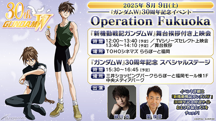 TOHO Cinemas LaLaport 福岡將舉行舞臺問候新機動戰記鋼彈W screening,LaLaport 福岡將在 LaLaport 福岡購物中心大樓 1 樓的中央媒體公園舉辦“鋼彈W 30 周年特別舞臺”。