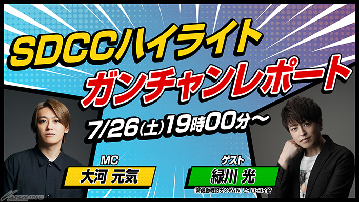 在《機動戰士鋼彈W》中扮演希洛‧唯的綠川光作為嘉賓,作為MC的元氣大河將出現在特別節目「SDCC(聖地牙哥動漫展)亮點甘燦報告」中,該節目定於7月26日星期六19:00在YouTube鋼彈頻道直播。