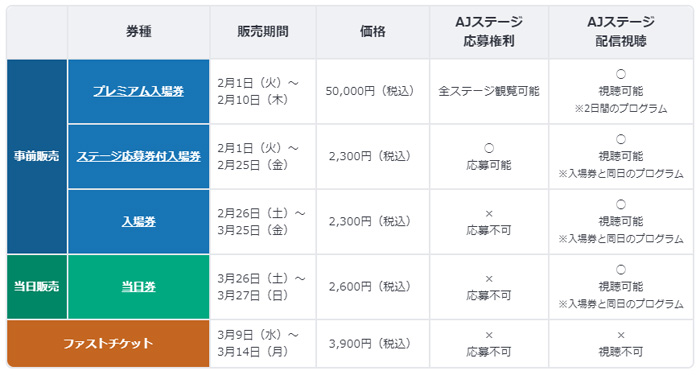 入場券有事先販售的「PREMIUM入場券」「附舞台報名券入場券」「入場券」,以及當天發售的「當日券」、「快速入場券」共5種。可以觀賞和入場券同日期的「AJ舞台活動」,各類門票好評販售中。