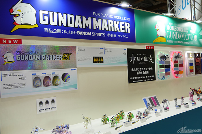GSI CREOS的展位上,陳列有使用鋼彈麥克筆製作的模範作品。除了公佈會推出5種應對『機動戰士鋼彈 水星的魔女』鋼彈模型的水性鋼彈色新顏色外,還有使用金色跟銀色鋼彈麥克筆塗裝的模範作品登場。