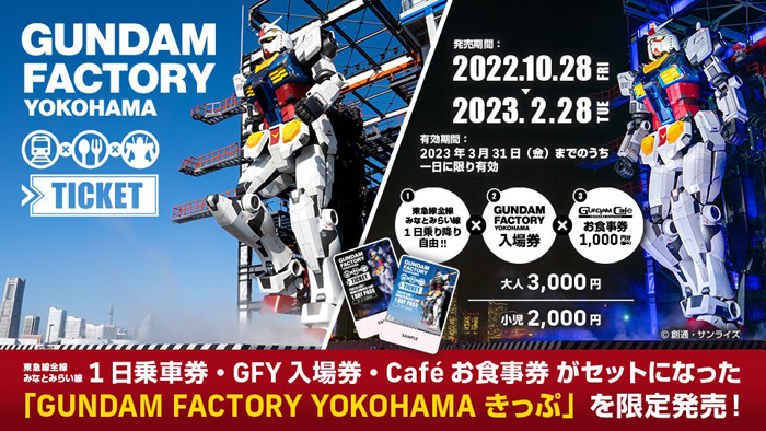 不只內含能自由搭乘東急線全線和港未來線全線一日遊車票,還和GFY入場券、可以在設施內咖啡廳「GUNDAM Café YOKOHAMA Satellite」使用的1000日圓面額餐券成套推出。