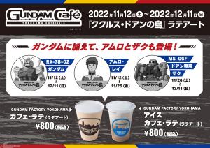另外,除了會在會議室播放『庫克羅斯・德安之島』開頭片段以及飾演阿姆羅・雷的古谷徹的致詞影片外,還有展示13座角色展板及複製原畫。並會在GUNAM Café YOKOHAMA Satellite販售「阿姆羅」「RX-78-02 鋼彈」「德安專用薩克」的3種設計拿鐵。