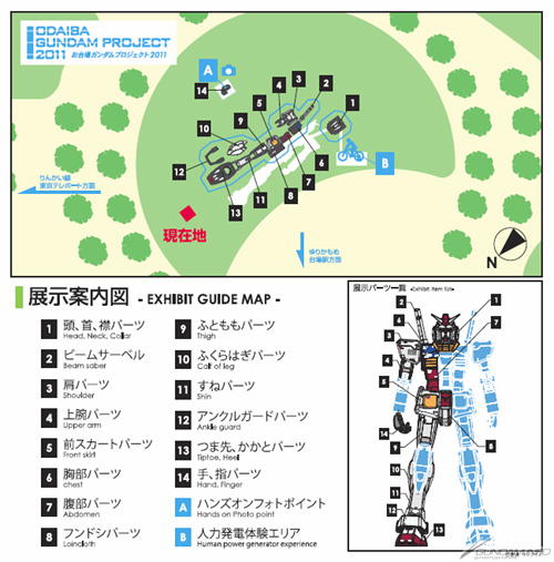會場中將會展出包含頭部、右手等以右半身為中心的零件,從「頭、襟」到「腳尖、腳跟」一共14處。胸部、肩部、光束軍刀等,在立像姿態時因太高而不容易看清楚的部分,都能夠近距離觀賞。