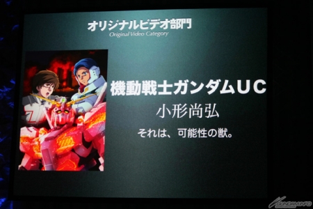 『機動戰士鋼彈UC』是由SUNRISE的小形尚弘製作人登台,他表示「繼去年之後還能夠再次榮獲這個獎項真的是非常感謝。能夠成為得獎作品中唯一的機器人動畫,也讓我感到非常驕傲。製作現場現在也已進入episode 5的最後完成階段,我們會以5月19日的上映、發售為目標努力,所以請各位務必前來觀賞。全體工作人員也會以明年繼續奪得這個獎項為目標繼續努力,今後還請多多指教。」
