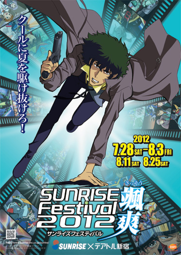即將在本週末7月28日(六)起於東京Theatre新宿舉辦的放映活動「Sunrise Festival 2012颯爽」。入場券價格為夜間上映每次4,000日圓,等同於4張一般上映門票的超值回數票5,600日圓,包含夜間票與回數票的特別票9,500日圓。另外,當日票分別為成人(國中生以上)1,500日圓,孩童(小學生以下)500日圓。 ※8月1日(三)為特別優惠日特價1,000日圓。