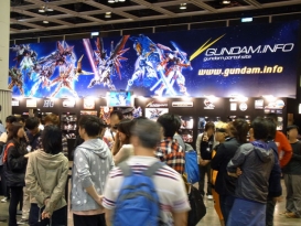 ▲轉蛋、食玩、景品等等受歡迎的最新商品區塊擠得水洩不通,很受到香港鋼彈粉絲們的青睞。攤位中的一角還有以亞洲為中心,向海外展開中的「GUNDAM.INFO」通知!