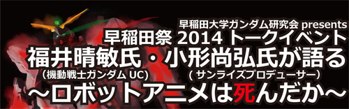 11月2日(日)早稻田大學的學園祭將舉行「早稻田祭2014座談會 由福井晴敏・小形尚弘暢談~機器人動畫是否已經死亡~」。