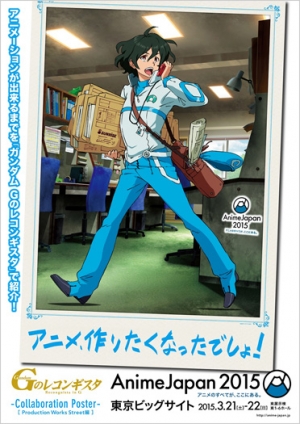 此外,「AnimeJapan 2015」的主旨為「娛樂」、「闔家」、「商業」等多樣化的展開使作品讓更多人知道而企劃的作品合作海報也將大量登場。 以『鋼彈RECONGUISTA IN G』的海報為例,是介紹動畫製作現場「Production Works Street」,繪製了擔任制作統籌的貝爾利工作時的樣子。