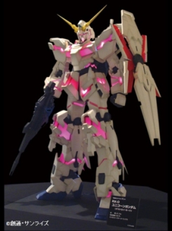 九州初次公開的「獵魔鋼彈」1/10立像[左]、閃耀著LED燈光的「獨角獸鋼彈(毀滅模式)」1/10立像[右]