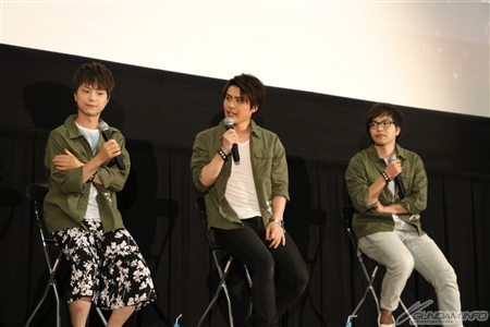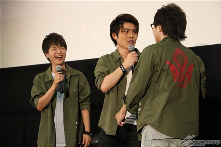 這次蒞臨的三位所飾演的角色都是鐵華團的MS駕駛員,關於這點,村田先生回想到說「當初沒有想到竟然可以駕駛MS。所以當能講『出擊!』這句出動時的台詞時,真的感到非常開心」,河西先生也提到「因為真的很想詮釋出擊時的場面,所以真的非常高興」,兩位皆非常開心地如此表示。就在這時候,擔任MC的SUNRISE企劃擔當・谷口廣次朗先生,提到了在出擊的場面中,為何唯獨重鍛型智魔鋼彈沒有出現的理由,原來是因為智魔鋼彈太大台了,和獵魔鋼彈、流星號不同,所以是從別的地方出擊,聽到此事後整個會場還有聲優們都發出了驚呼。而終於了解到原因内匠先生表示「關於這部分,第二季還請特別多多關照」。
