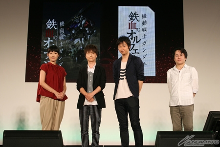 首先是登台者河西、寺崎、小川製作人3位上台後,馬上放映日本首次公開的『鐵血孤兒』第2季最新PV。河西看了之後用興奮不已的樣子說「雖然我也是今天才第一次看,但是即使在錄音時就已經知道內容,心情還是非常開心呢!」,寺崎則以PV開頭採用第1季濃縮內容的部分說到「雖然覺得有些感傷,但是因為有第1季才有第2季的誕生,我想必需重新打起精神才行」。
