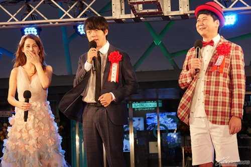 從左至右分別為歌舞伎町商店街振興組合理事長 片桐基次、新宿區長 吉住健一、福住明美、BANDAI NAMCO Entertainment董事長 大下 聰、Woman Rush Hour的村本大輔&中川天堂、東急Agency董事長 桑原常泰