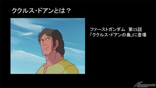訪談從「庫庫魯斯・德安」的介紹開始。雖然是動畫『機動戰士鋼彈』中登場的角色,也有在TV系列中出現過,但在電影版3部曲中卻無緣登場,因此這次就兼作複習來重新介紹一下。