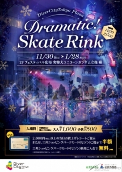 戶外型溜冰場「Dramatic溜冰場」位於Diver City Tokyo Plaza 2F節慶廣場的「實體大獨角獸鋼彈立像」旁,時間至2018年1月28日(日)。場地採用樹脂板,能享受到溜冰的樂趣又不怕沾溼衣服,更利用了點燈裝飾表現出屬於冬季的浪漫空間。