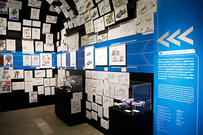 河森老師想在展示中表現的像是點子是如何誕生的、是否有再加強訓練,以及傳達製作過程即思考方式本身。不僅有概念筆記,還有製作音樂時對作曲家的指示、設計圖草稿,同時也有送監修的立體物,主展示場也擺放了模型立像,展示內容整體來說可說是非常豐富。