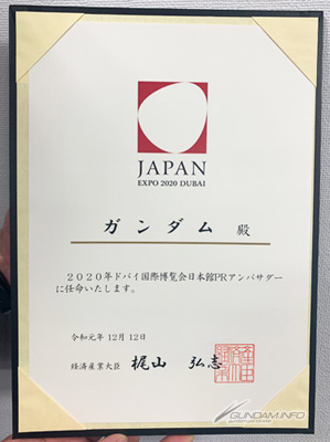 從梶山經濟產業大臣手中授予”任命狀”的「大使任命儀式」,富野由悠季監督也與鋼彈一同出席。
