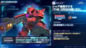 UR“鋼彈原型 2 號(EX)”/UR“安娜貝爾·加藤”作為限時拾取扭蛋登場。 此外,UR “Char Exclusive薩克II(THE ORIGIN Version) (EX)” / UR “夏亞.阿茲納布爾(THE ORIGIN Version)”和支援者UR “Aper Synapse & Albion” 將會出現。