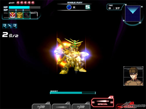 ▲閃耀著金色光芒的神威鋼彈(超級型態發動中)。即將展開宛如怒滔般的攻撃!