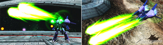【MS形態/飛行形態】副射擊武裝為從大型推進器前端的大型粒子砲進行發射。