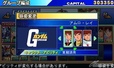 「阿姆羅」和「夏亞」等部分擁有複數容貌的角色,可透過「容貌變更」變換為喜歡的容貌。阿姆羅則可選擇『鋼彈』、『Ζ鋼彈』、『逆襲的夏亞』中登場的容貌。