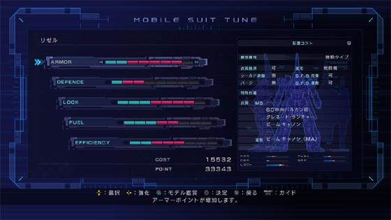 能夠使用遊戲中獲得的點數、強化MS、角色和武裝等。