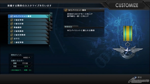 本作能夠在戰鬥結束後獲得強化零件,可藉由將之裝備在MS上提升MS的性能。