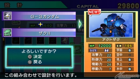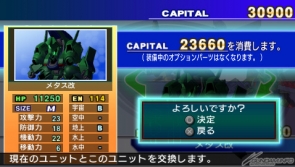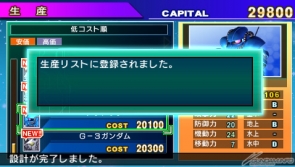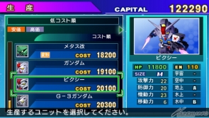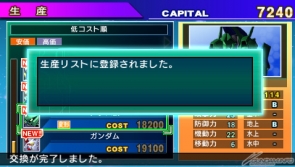 「生産」則是支付遊戲內的貨幣「CAPITAL」,就可以自由地製作出在生產列表上有的機體了。機體的開發與設計,以及捕獲敵機都可以增加列表,積極的充實列表內容將與戰力的強化密不可分!