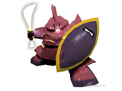 『機動戰士鋼彈』中登場的MS。武器2「光束步槍」有硬直效果,光束射中對手的時候會使敵人一瞬間動作停止,請積極的使用。另外、技能2「紅色彗星夏亞」是在機體HP沒有在50%以下的時候不會發動,發動中會使機體大幅力量提升,會更加容易戰鬥。