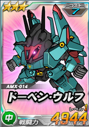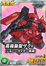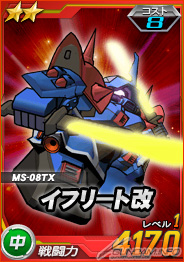 另外,擊破本機體就可以挑戰「機會轉蛋機」,獲得限定MS「高機動型薩克II(強尼・萊汀専用)」,以及在「王牌機體轉蛋機」追加發揮比「艾娜‧薩哈林搭乘的阿普薩拉斯II」還高出6倍攻擊力的「伊弗利特改」。